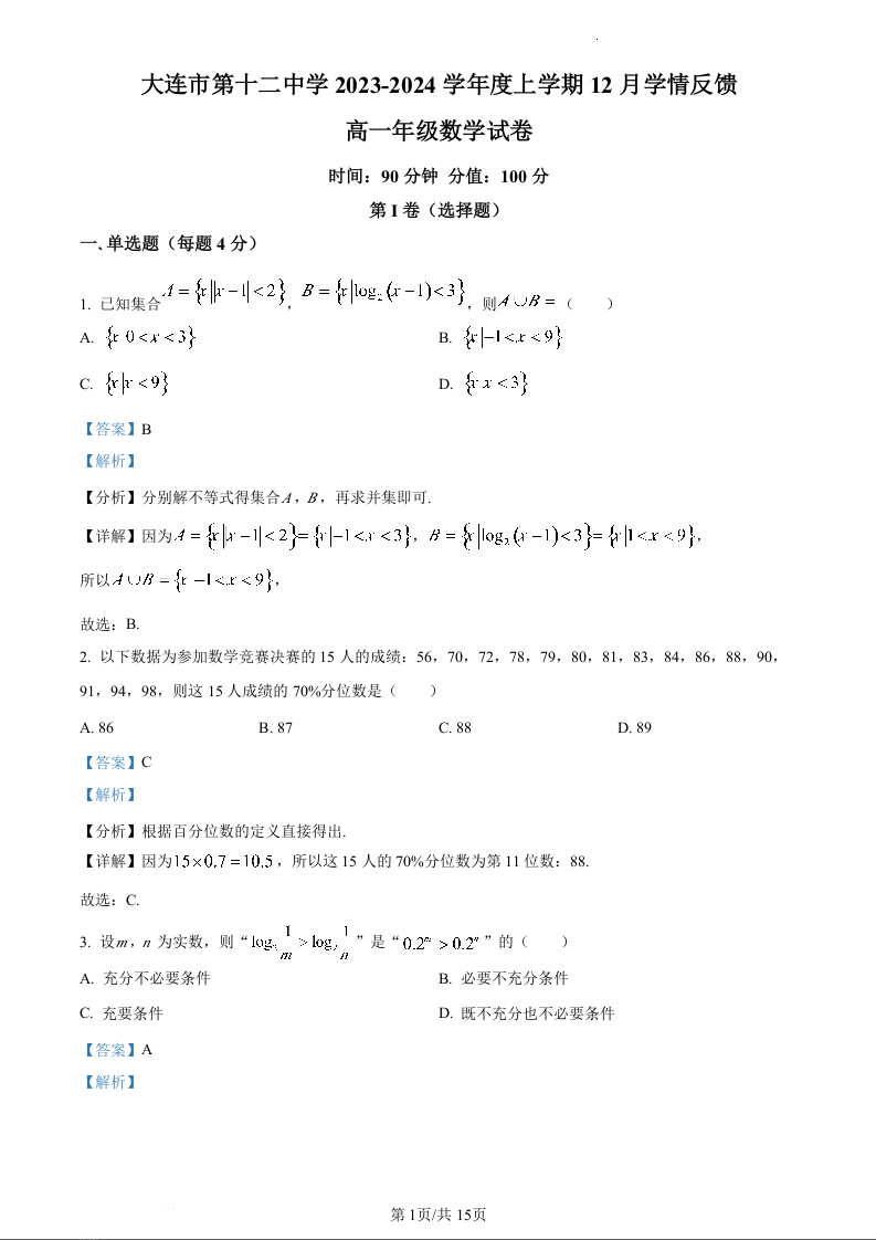 辽宁省大连市第十二中学2023-2024学年高一上学期12月学情反馈数学(精品解析版)