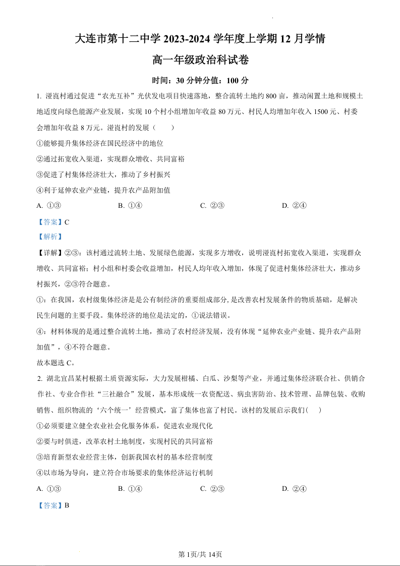 辽宁省大连市第十二中学2023-2024学年高一上学期12月学情反馈政治(精品解析版)