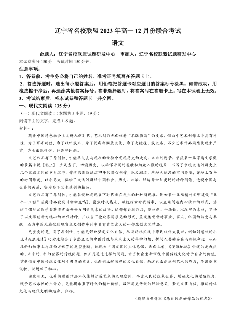 辽宁省名校联盟2023-2024学年高一上学期12月联考语文