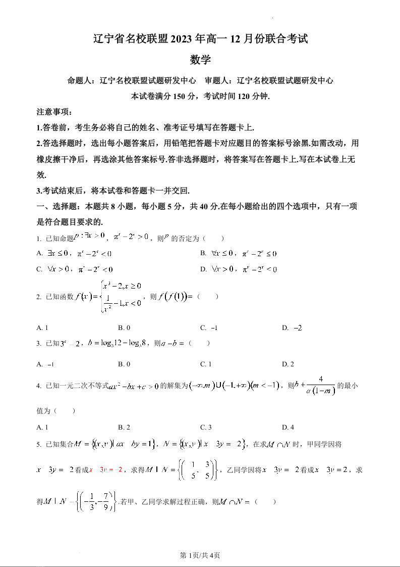 辽宁省名校联盟2023-2024学年高一上学期12月联考数学(原卷版)