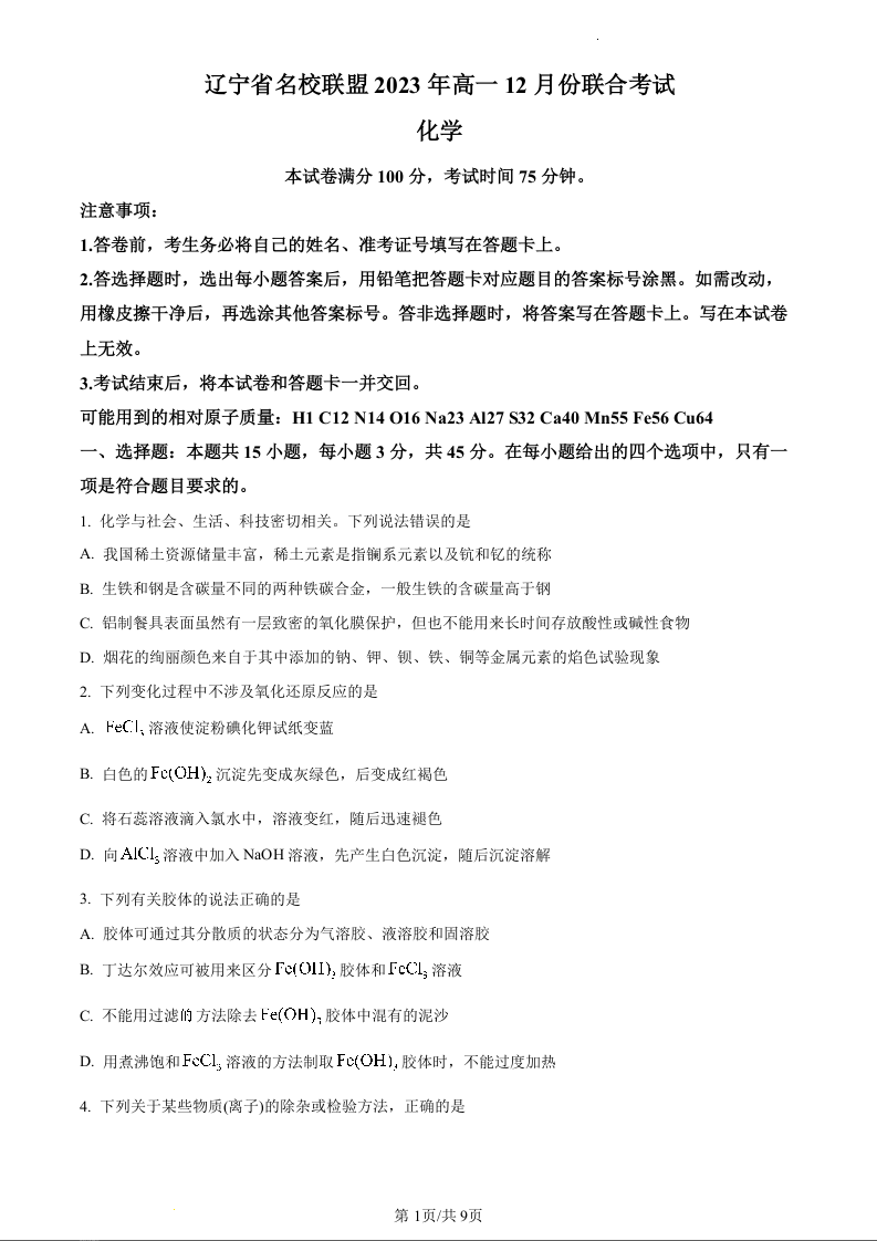 辽宁省名校联盟2023-2024学年高一上学期12月联考化学(原卷版)