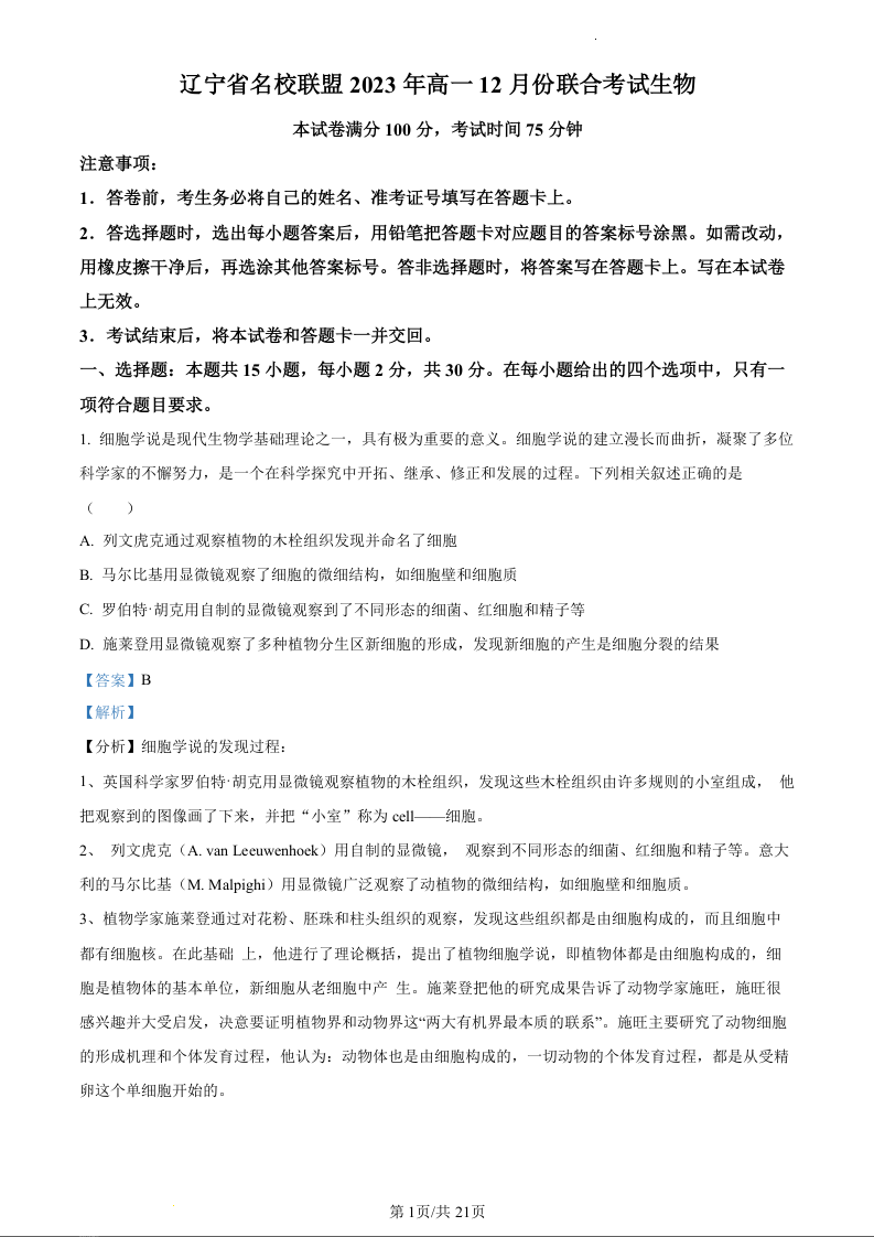 辽宁省名校联盟2023-2024学年高一上学期12月联考生物(精品解析版)