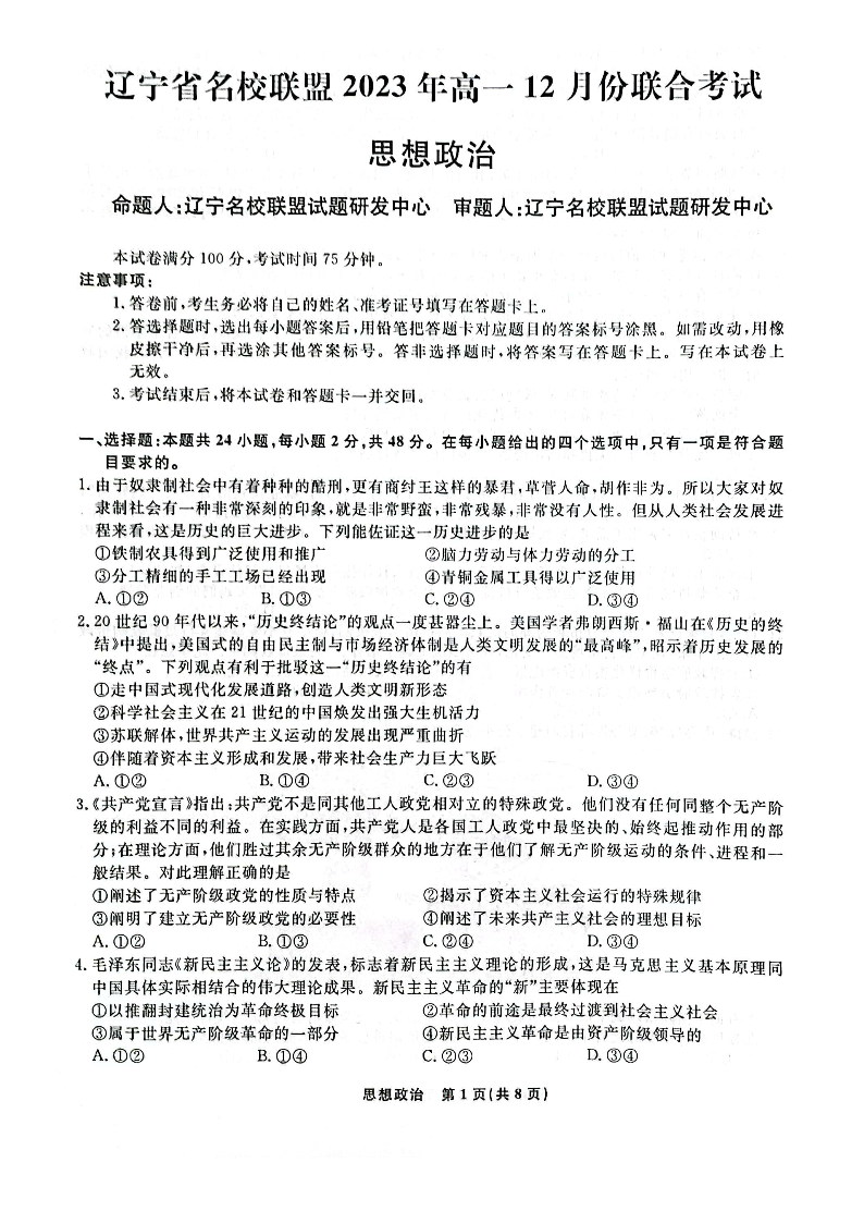 辽宁省名校联盟2023-2024学年高一上学期12月联考政治