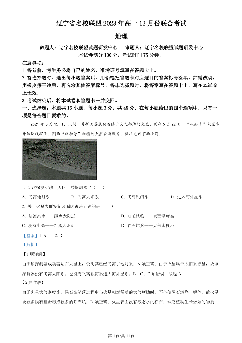 辽宁省名校联盟2023-2024学年高一上学期12月联考地理(精品解析版)