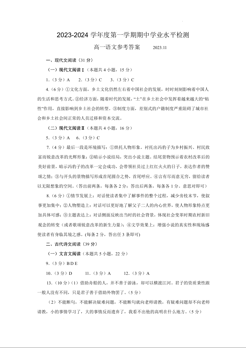 山东省青岛地区2023-2024学年高一上学期期中考试语文答案