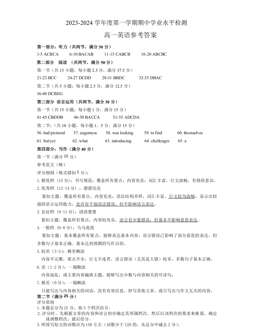 山东省青岛地区2023-2024学年高一上学期期中考试英语答案