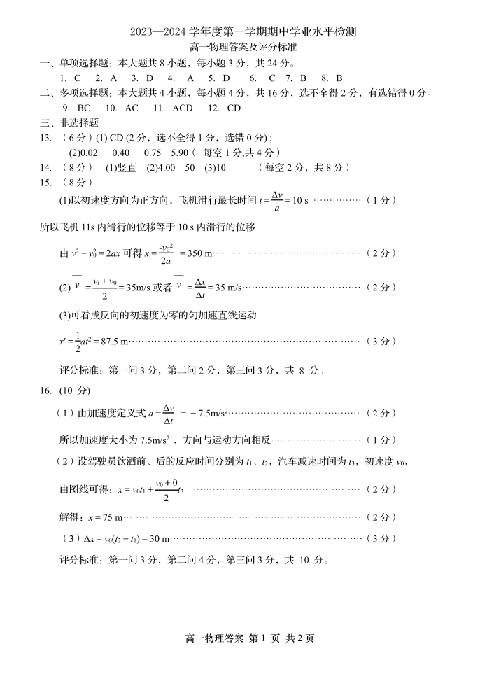 山东省青岛地区2023-2024学年高一上学期期中考试物理答案
