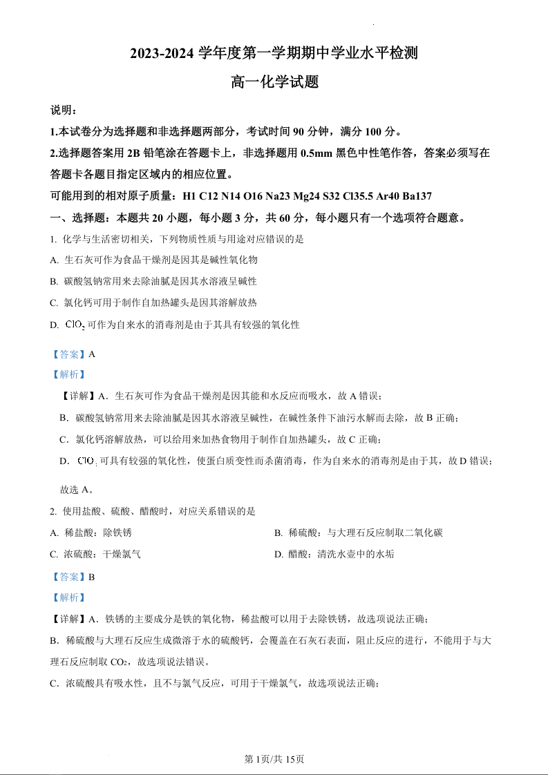 山东省青岛地区2023-2024学年高一上学期期中考试化学(精品解析版)