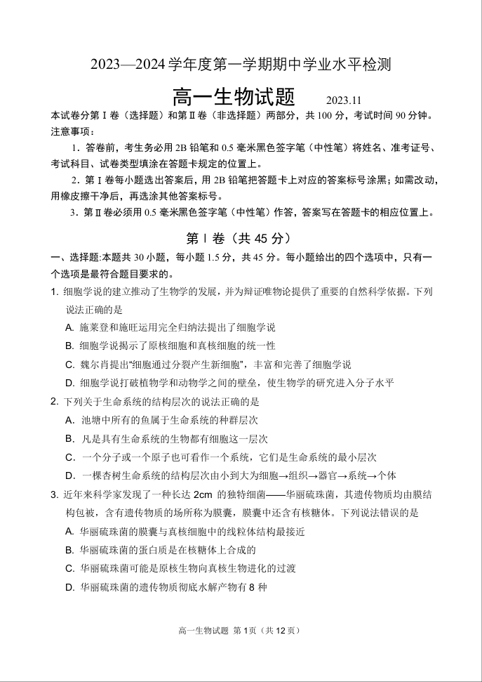 山东省青岛地区2023-2024学年高一上学期期中考试生物
