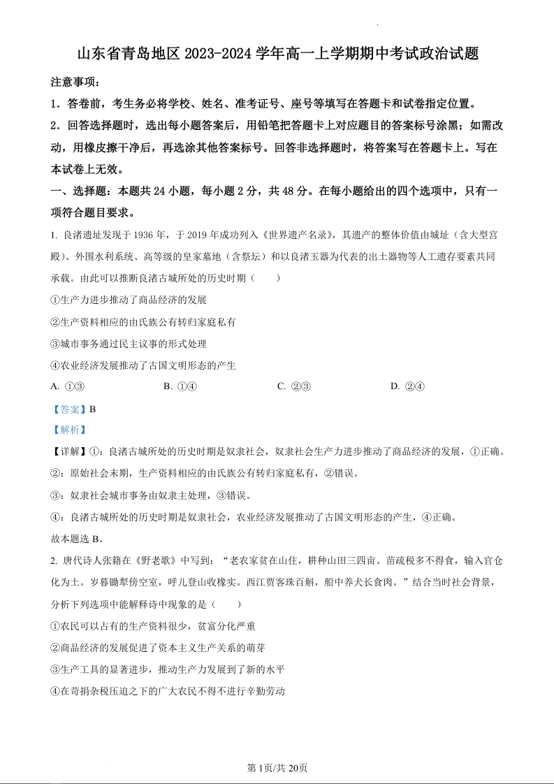 山东省青岛地区2023-2024学年高一上学期期中考试政治(精品解析版)