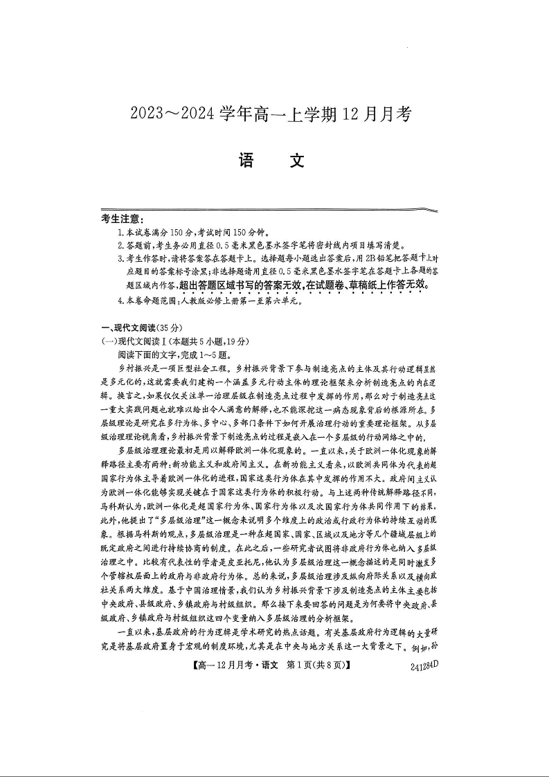 山西省大同市2023-2024学年高一上学期12月月考语文