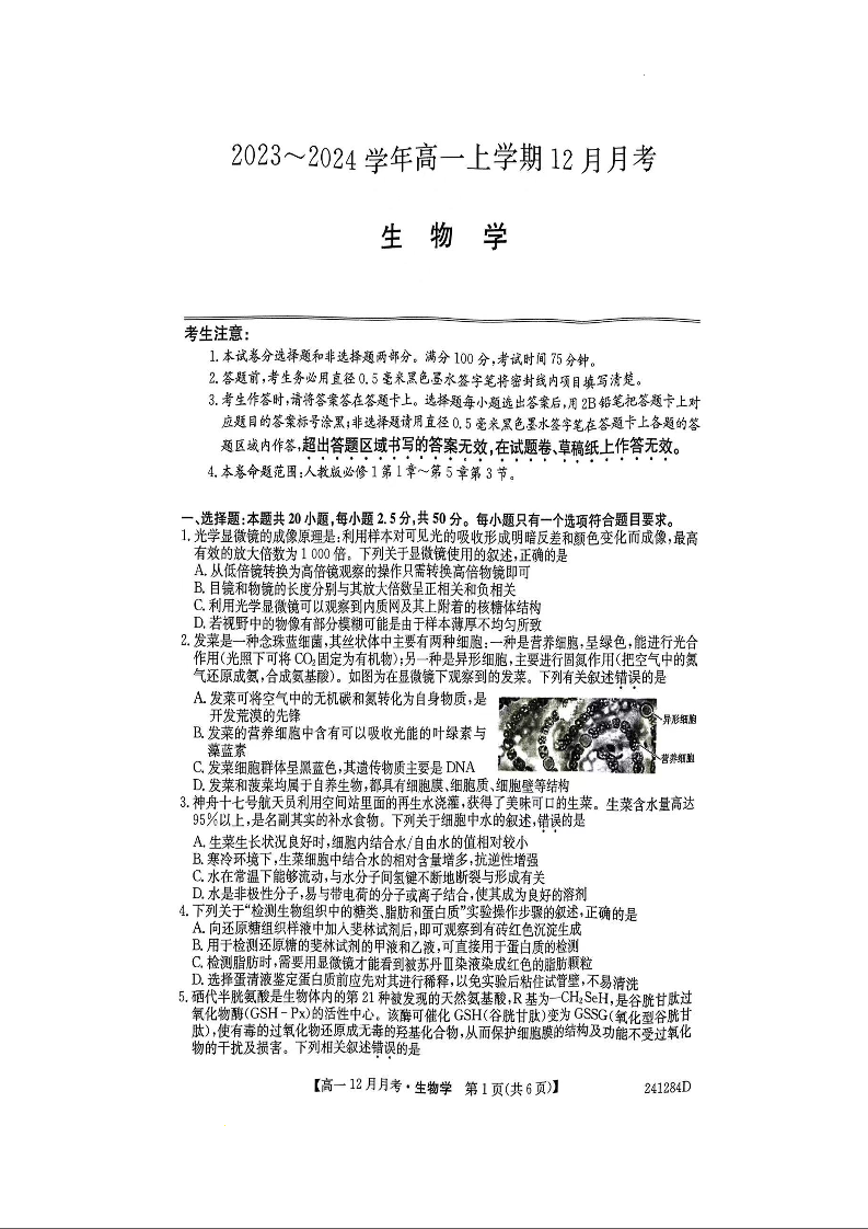 山西省大同市2023-2024学年高一上学期12月月考生物