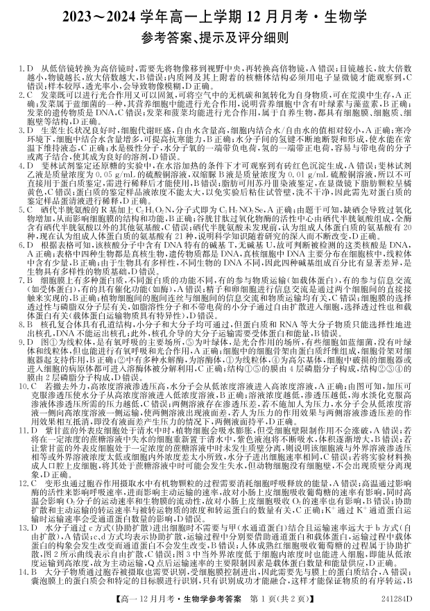 山西省大同市2023-2024学年高一上学期12月月考生物答案