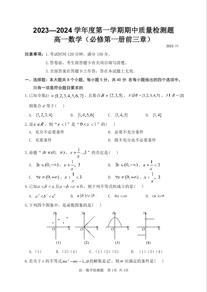 陕西省宝鸡市金台区2023-2024学年高一上学期期中考试数学
