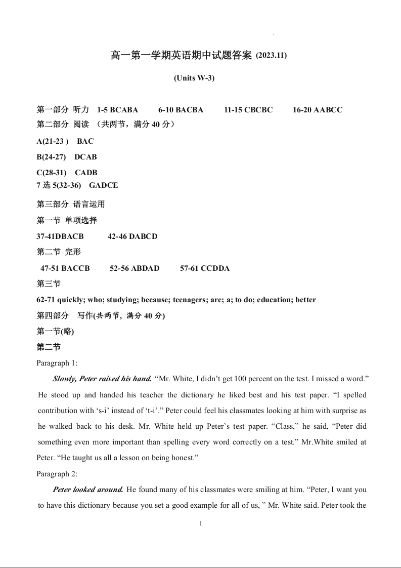 陕西省宝鸡市金台区2023-2024学年高一上学期期中考试英语答案