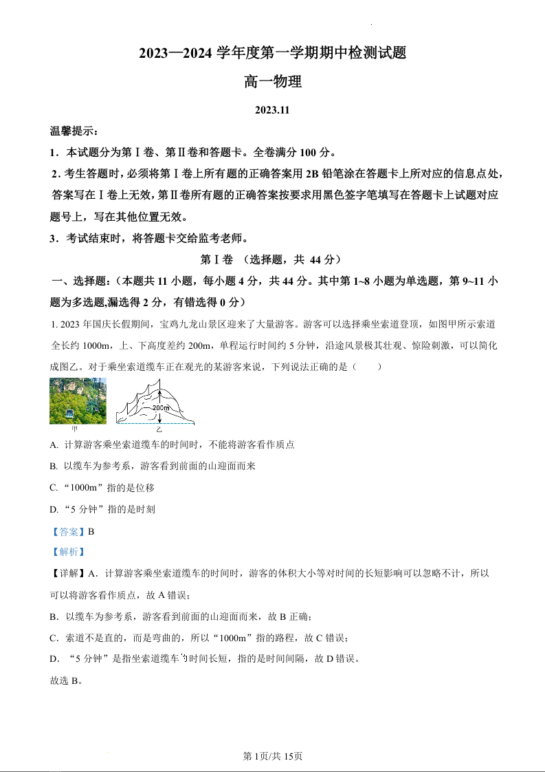 陕西省宝鸡市金台区2023-2024学年高一上学期期中考试物理(精品解析版)