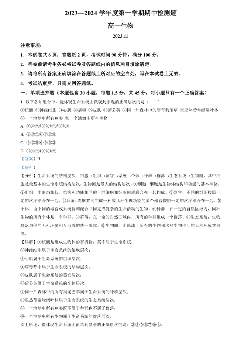 陕西省宝鸡市金台区2023-2024学年高一上学期期中考试生物(精品解析版)