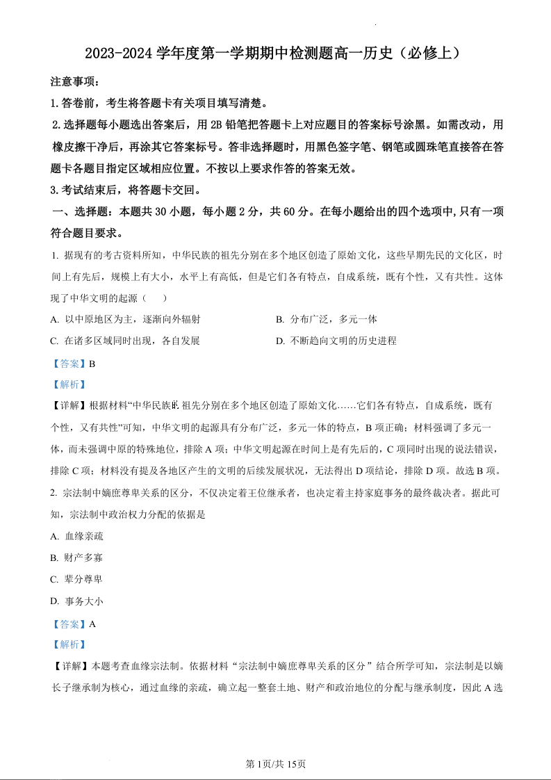 陕西省宝鸡市金台区2023-2024学年高一上学期期中考试历史(精品解析版)