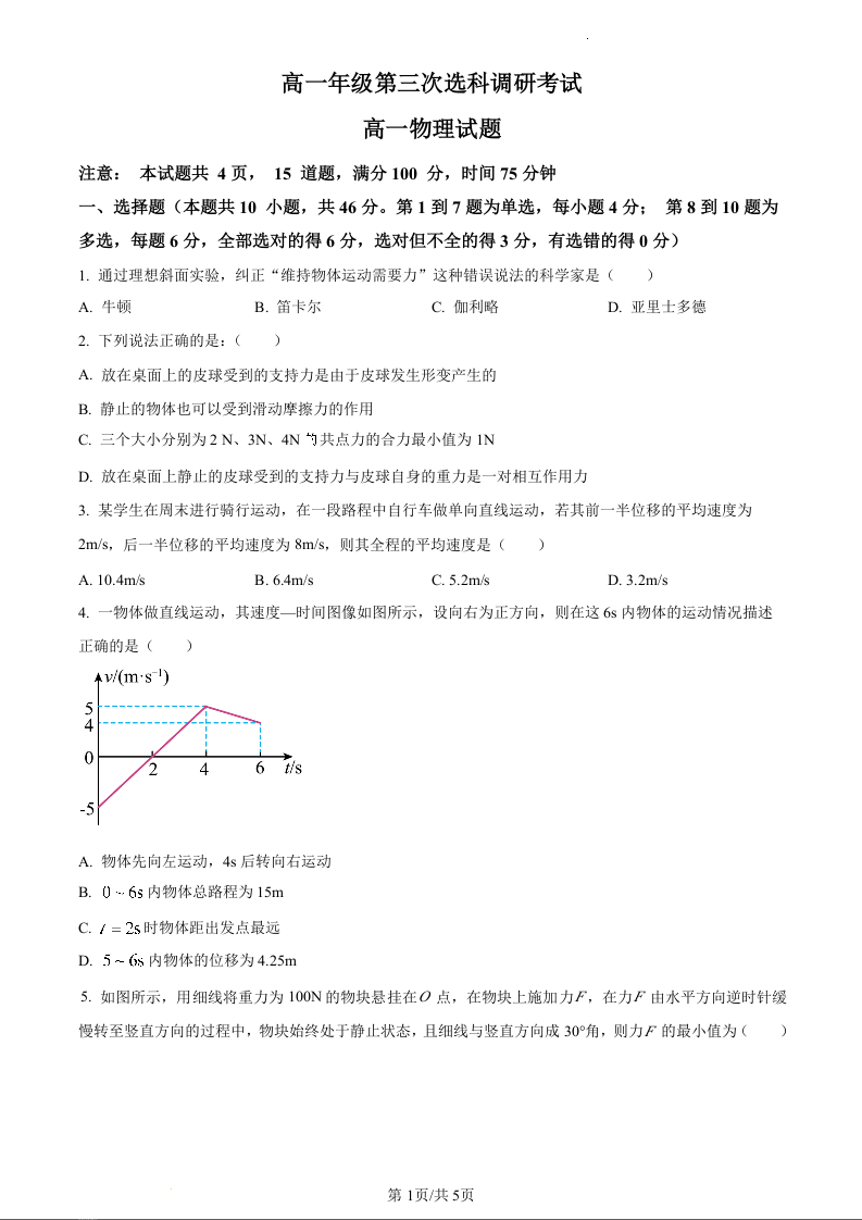 陕西省汉中市2023-2024学年高一上学期第三次选科调研考试物理(原卷版)