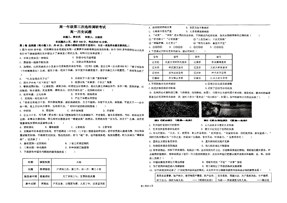 陕西省汉中市2023-2024学年高一上学期第三次选科调研考试历史