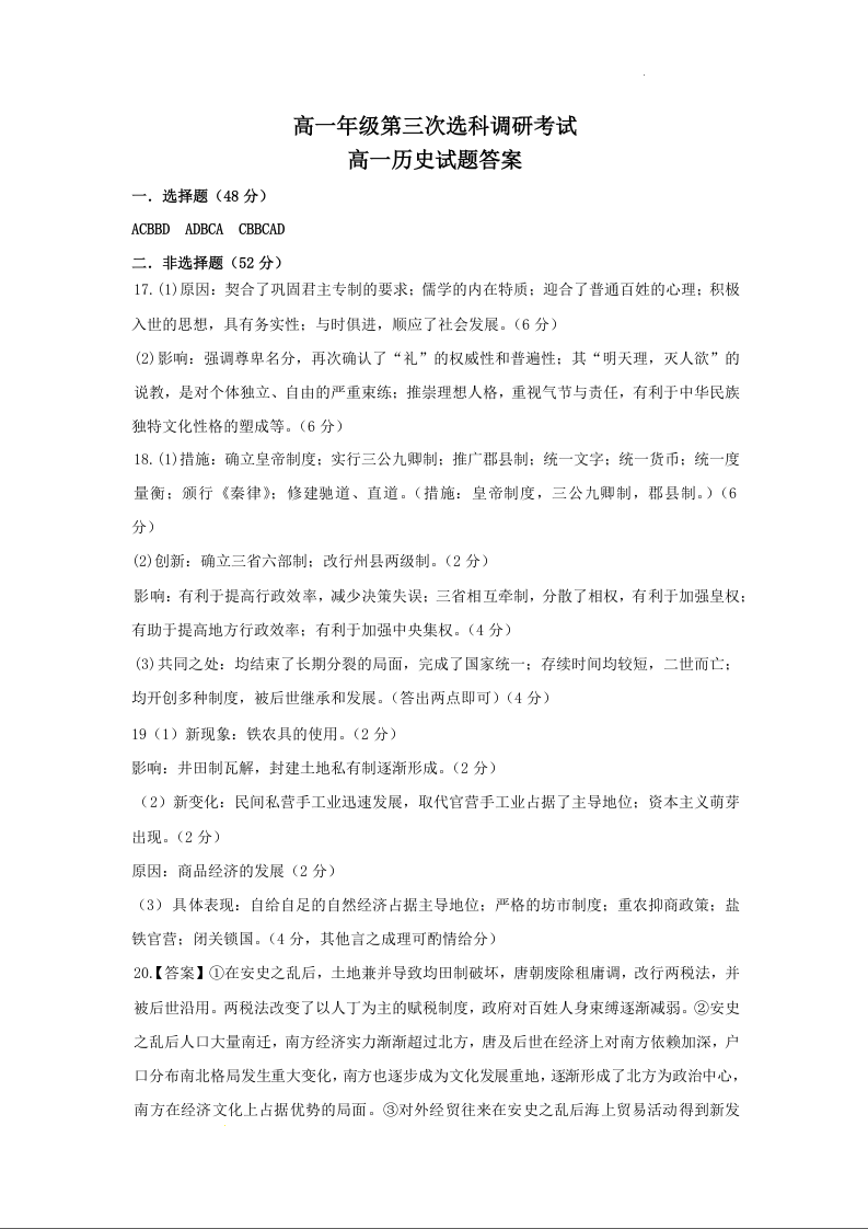 陕西省汉中市2023-2024学年高一上学期第三次选科调研考试历史答案