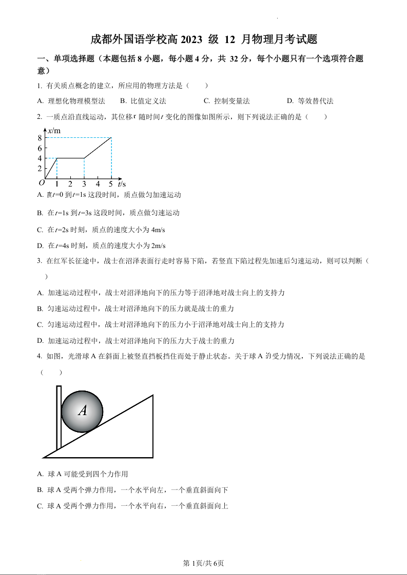 四川省成都外国语学校2023-2024学年高一上学期12月月考物理(原卷版)