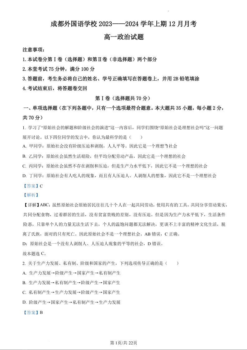 四川省成都外国语学校2023-2024学年高一上学期12月月考政治(精品解析版)