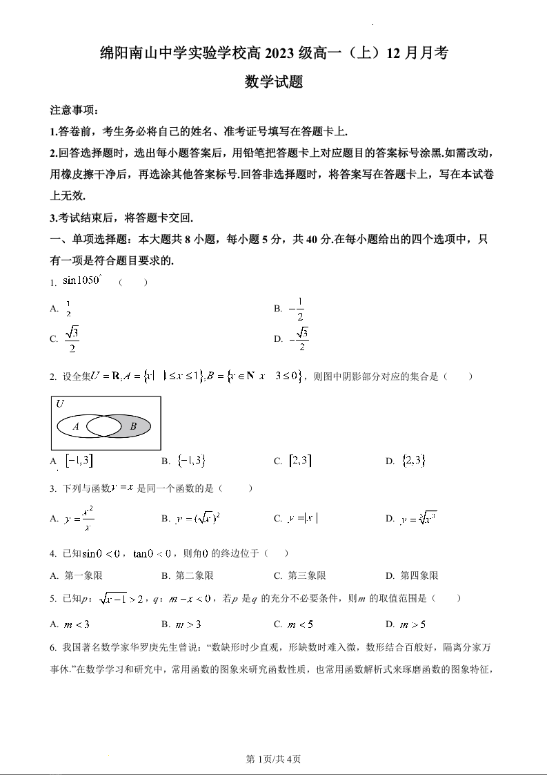 四川省绵阳南山中学实验学校2023-2024学年高一上学期12月月考数学(原卷版)