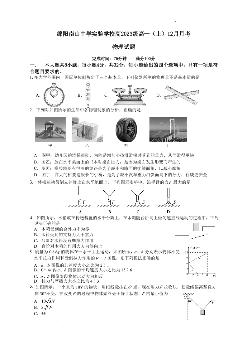 四川省绵阳南山中学实验学校2023-2024学年高一上学期12月月考物理+答案