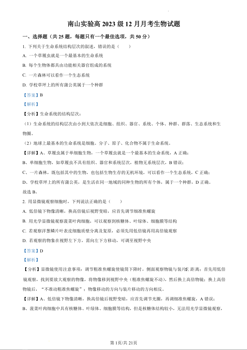 四川省绵阳南山中学实验学校2023-2024学年高一上学期12月月考生物(精品解析版)