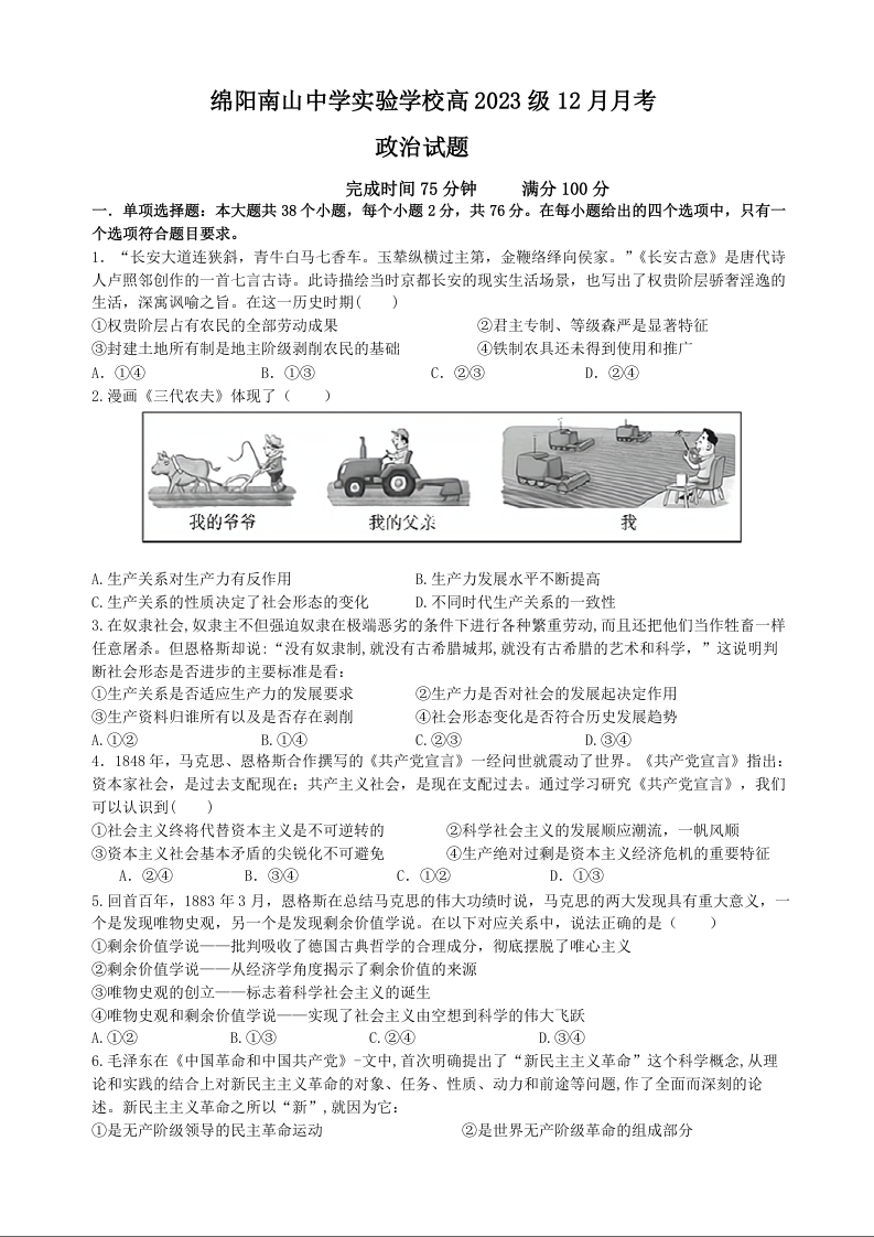 四川省绵阳南山中学实验学校2023-2024学年高一上学期12月月考政治+答案