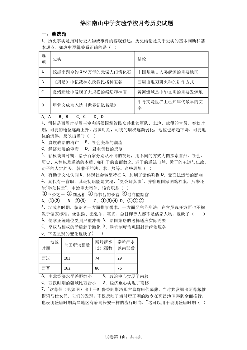 四川省绵阳南山中学实验学校2023-2024学年高一上学期12月月考历史+答案