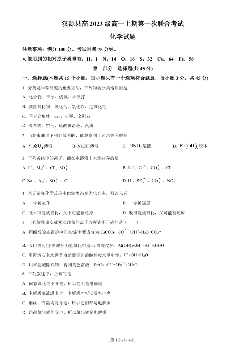 四川省雅安市汉源县2023-2024学年高一上学期第一次联测化学(原卷版)