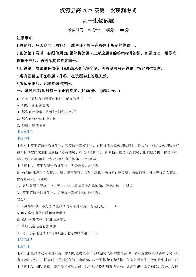 四川省雅安市汉源县2023-2024学年高一上学期第一次联测生物(精品解析版)