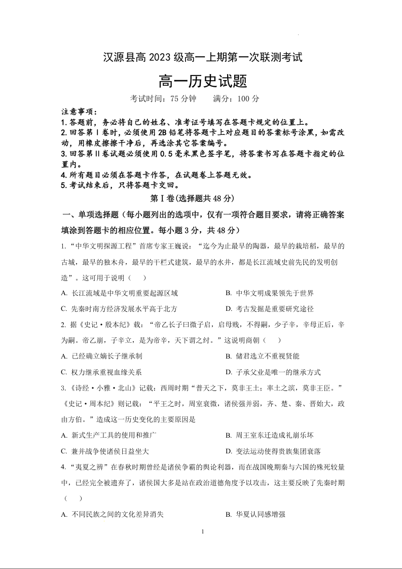 四川省雅安市汉源县2023-2024学年高一上学期第一次联测历史