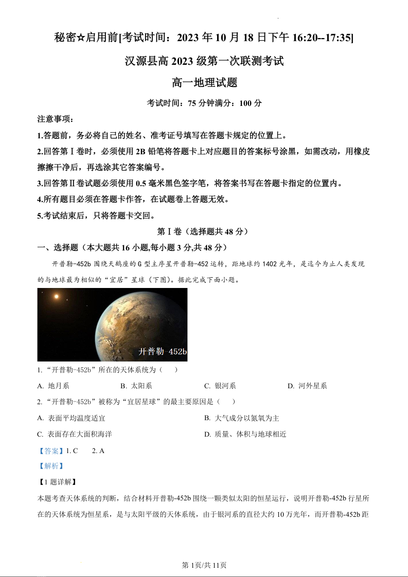 四川省雅安市汉源县2023-2024学年高一上学期第一次联测地理(精品解析版)