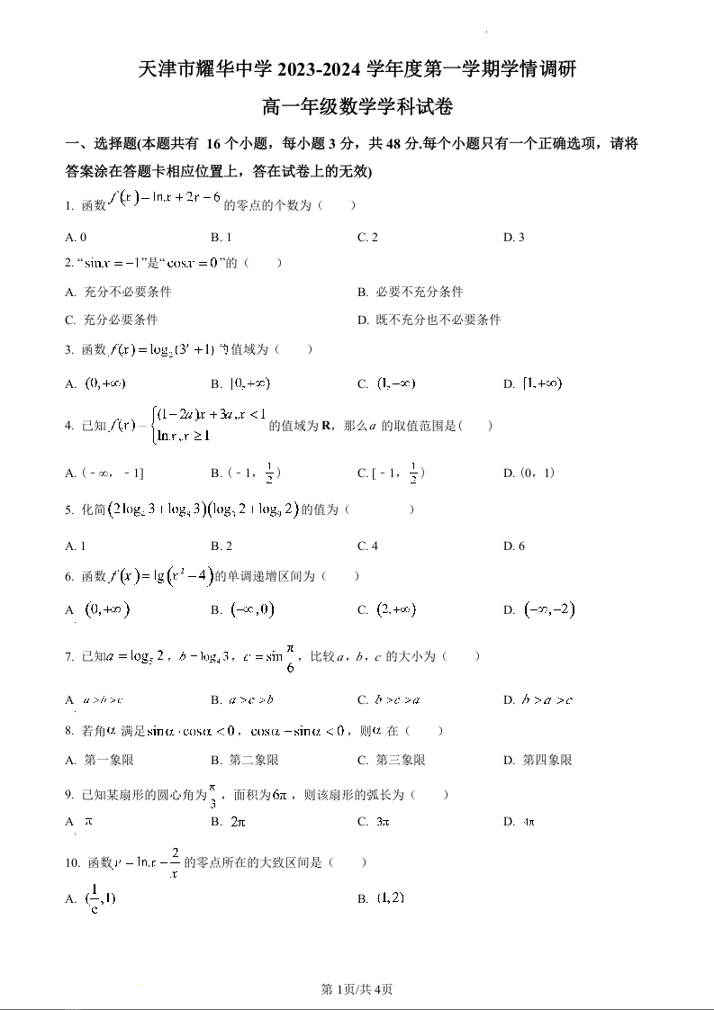 天津市耀华中学2023-2024学年高一上学期第二次月考数学(原卷版)