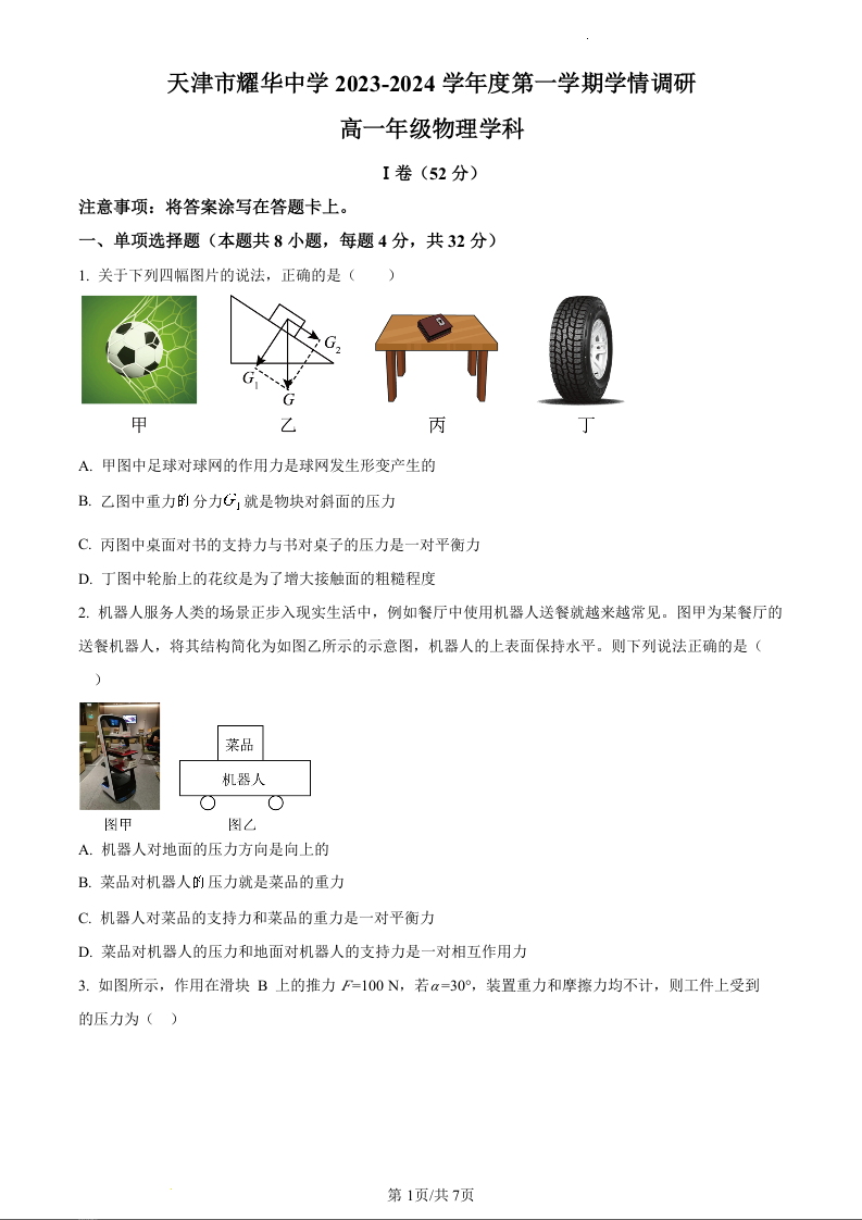天津市耀华中学2023-2024学年高一上学期第二次月考物理(原卷版)