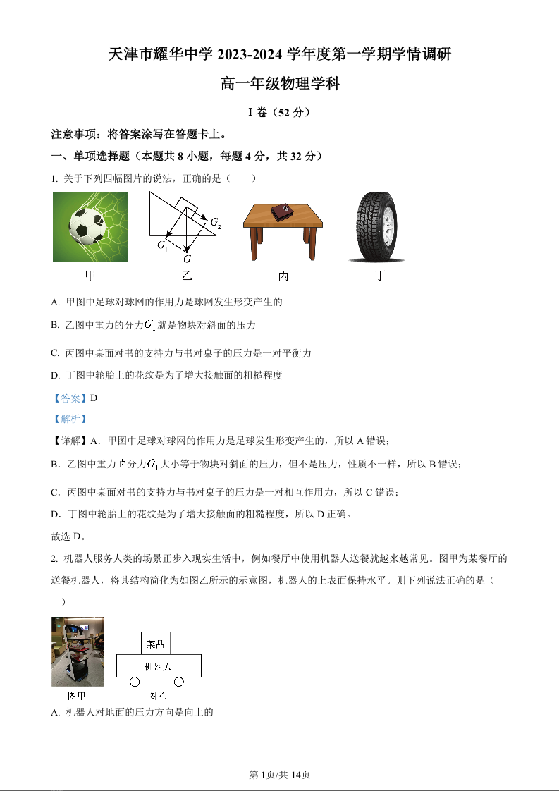 天津市耀华中学2023-2024学年高一上学期第二次月考物理(精品解析版)