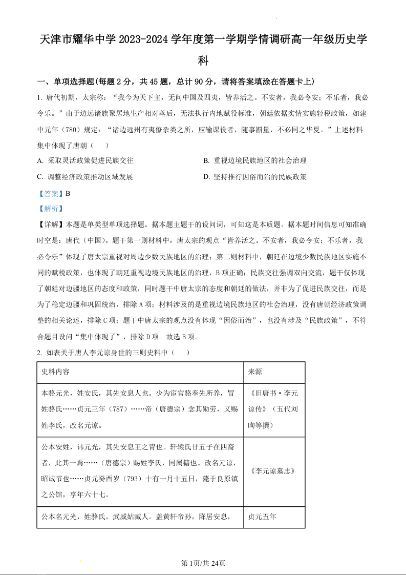 天津市耀华中学2023-2024学年高一上学期第二次月考历史(精品解析版)