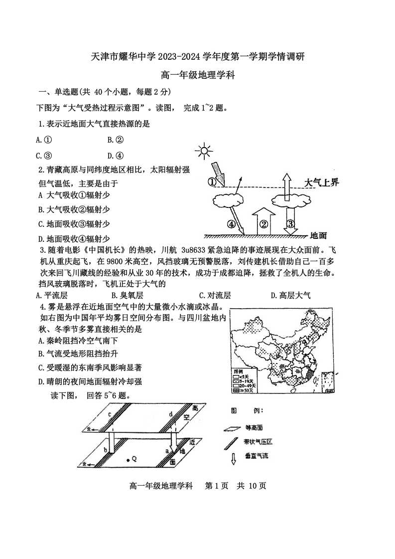 天津市耀华中学2023-2024学年高一上学期第二次月考地理+答案