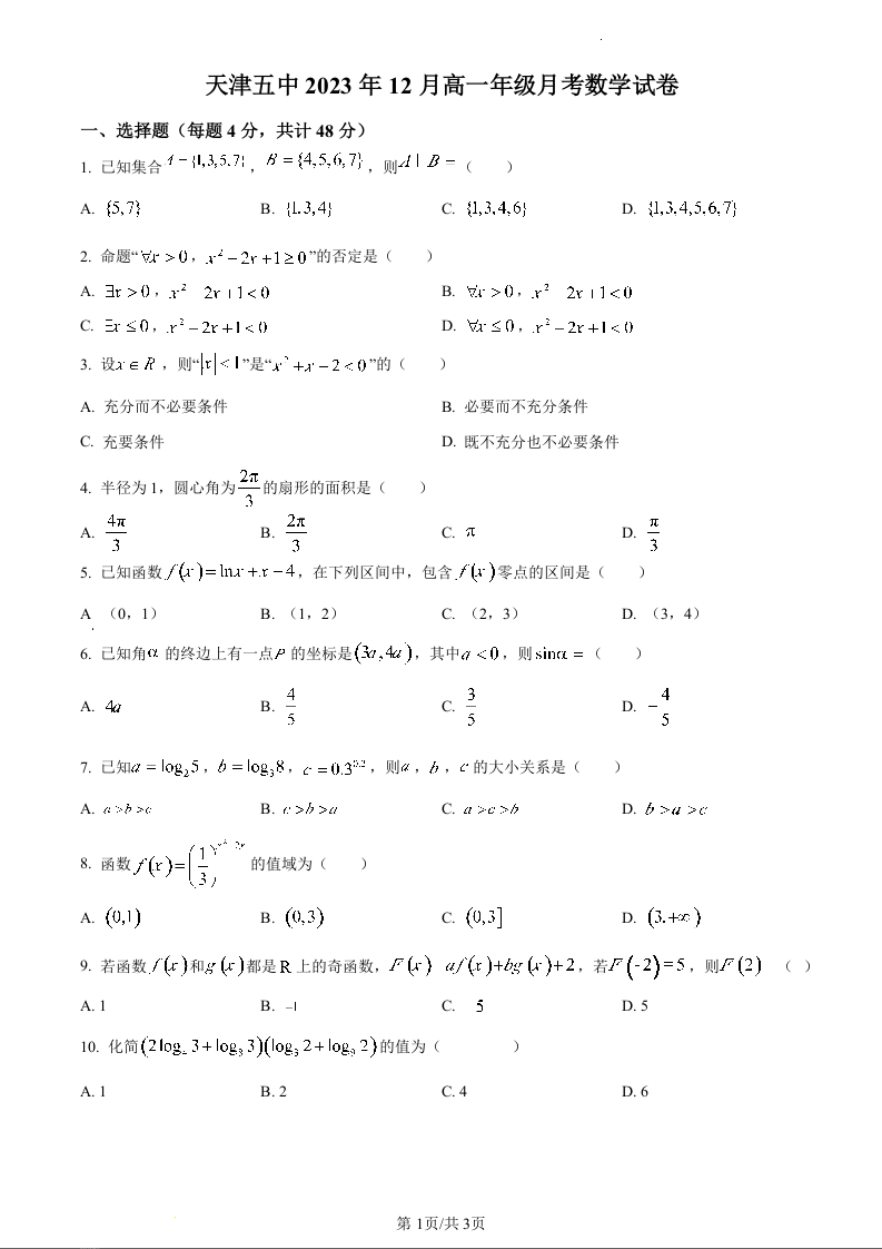 天津市第五中学2023-2024学年高一上学期12月月考数学(原卷版)