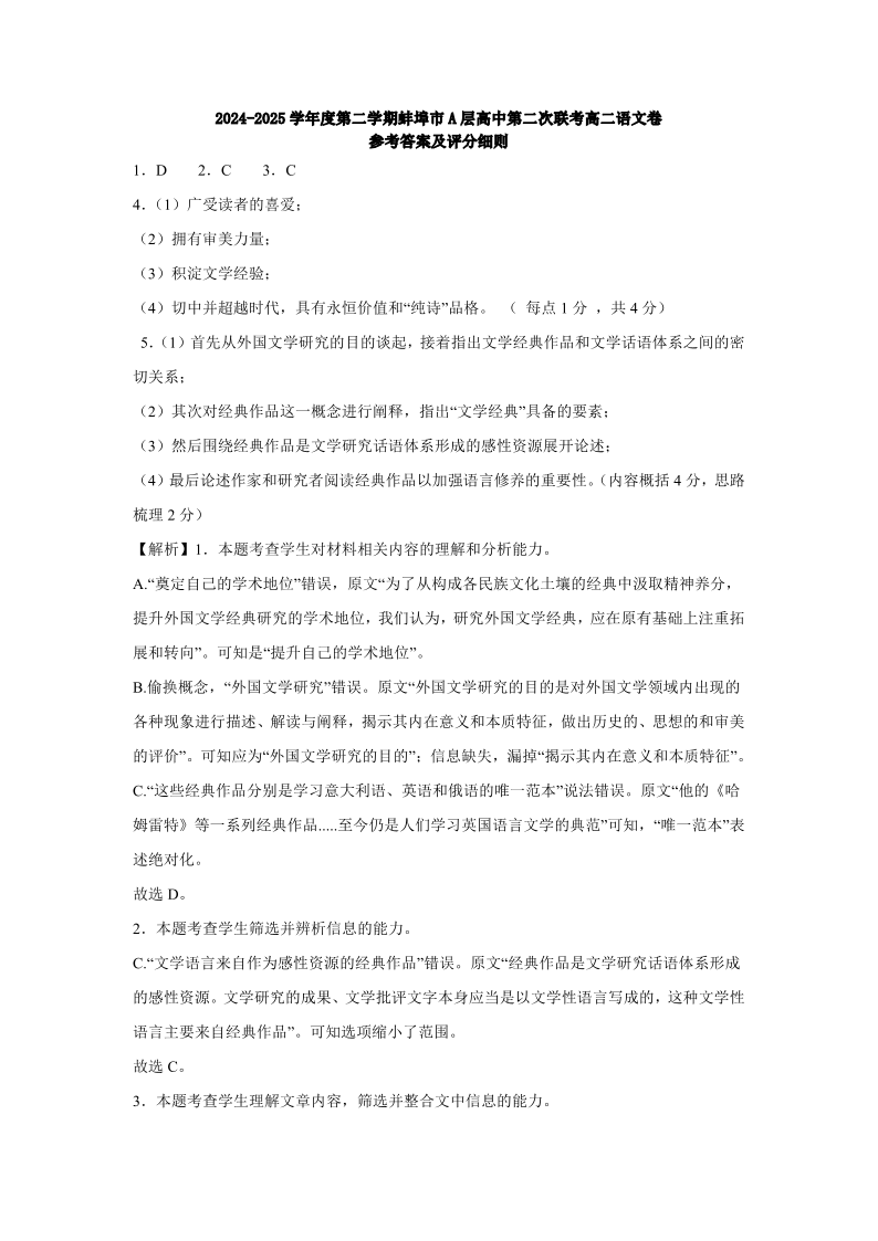 安徽省蚌埠市A层高中2024-2025学年下学期高二第四次联考语文答案