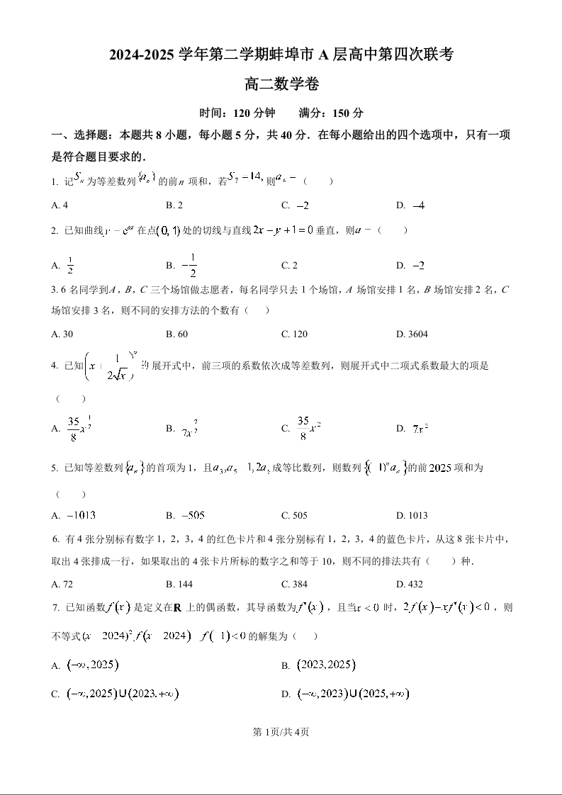 安徽省蚌埠市A层高中2024-2025学年下学期高二第四次联考数学(原卷版)