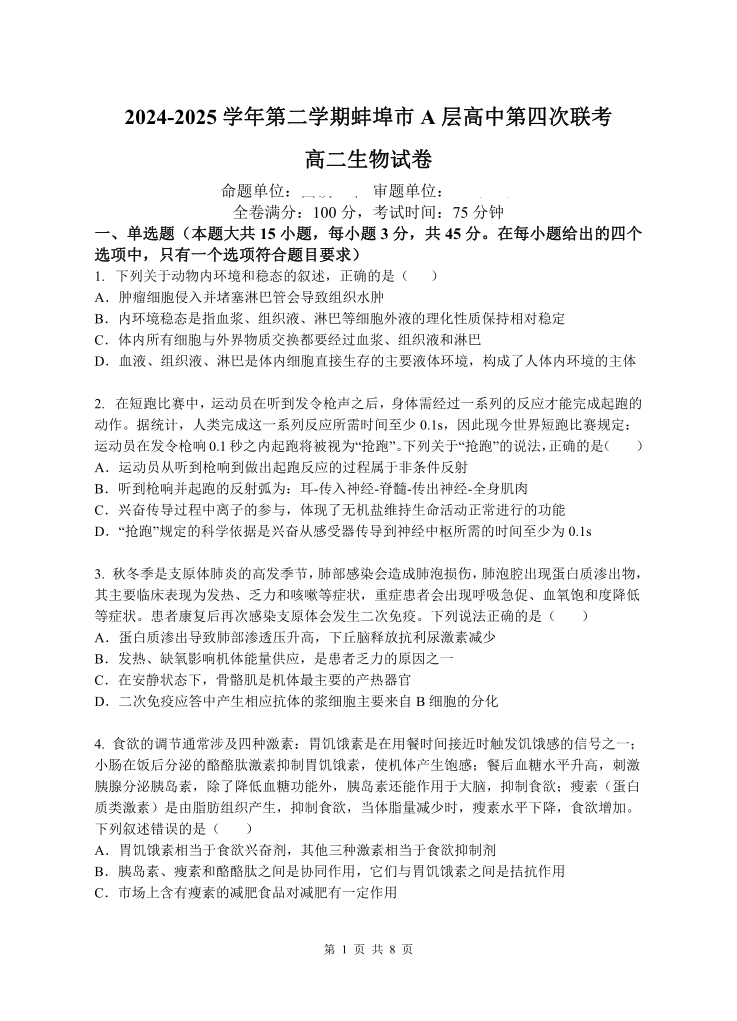 安徽省蚌埠市A层高中2024-2025学年下学期高二第四次联考生物