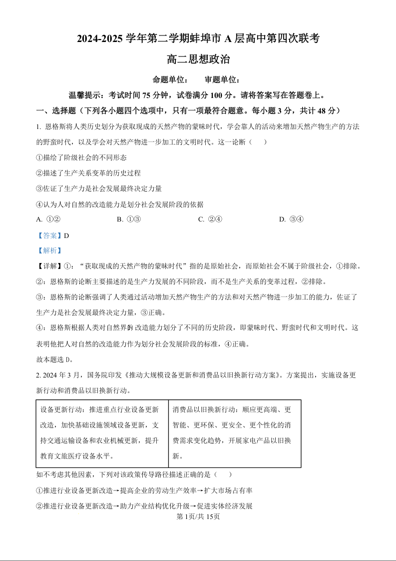 安徽省蚌埠市A层高中2024-2025学年下学期高二第四次联考政治(精品解析版)
