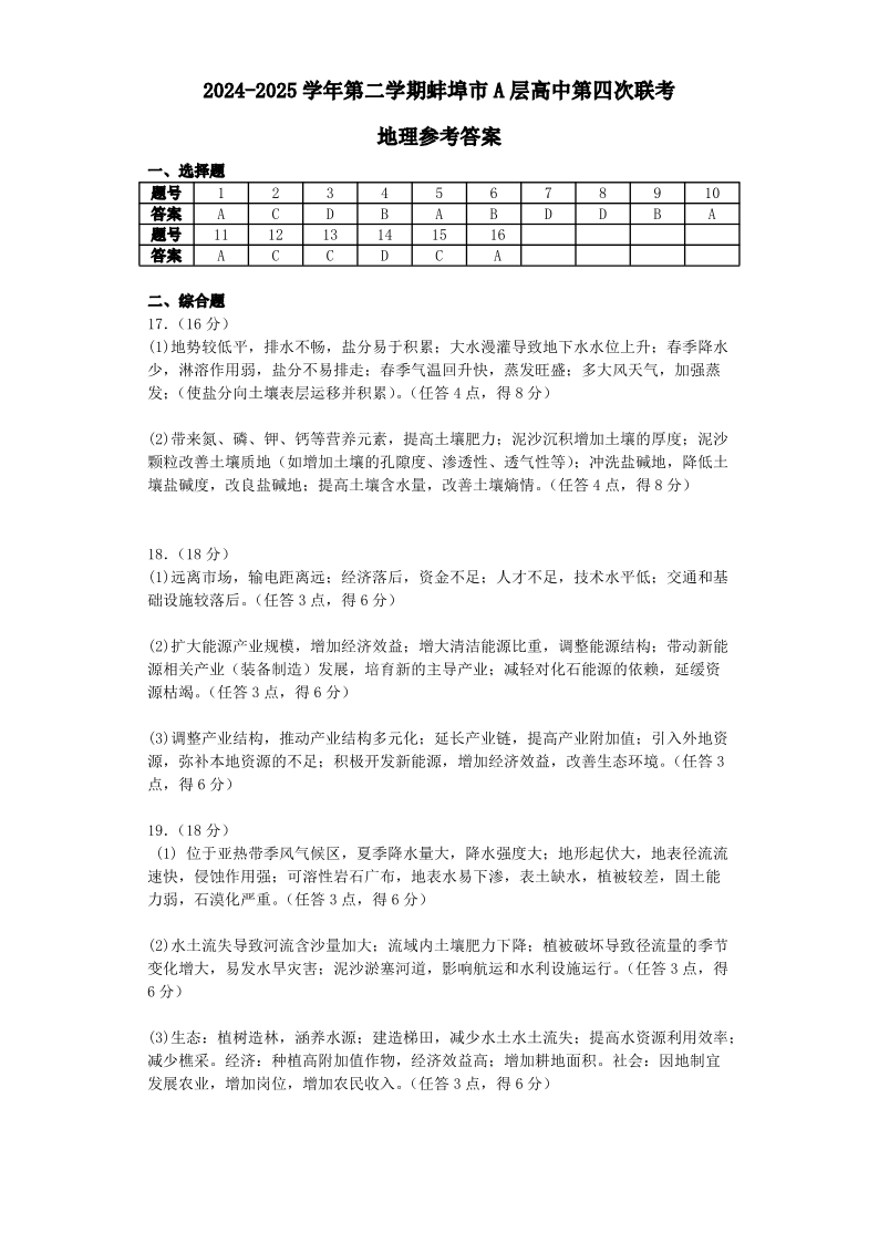 安徽省蚌埠市A层高中2024-2025学年下学期高二第四次联考地理答案