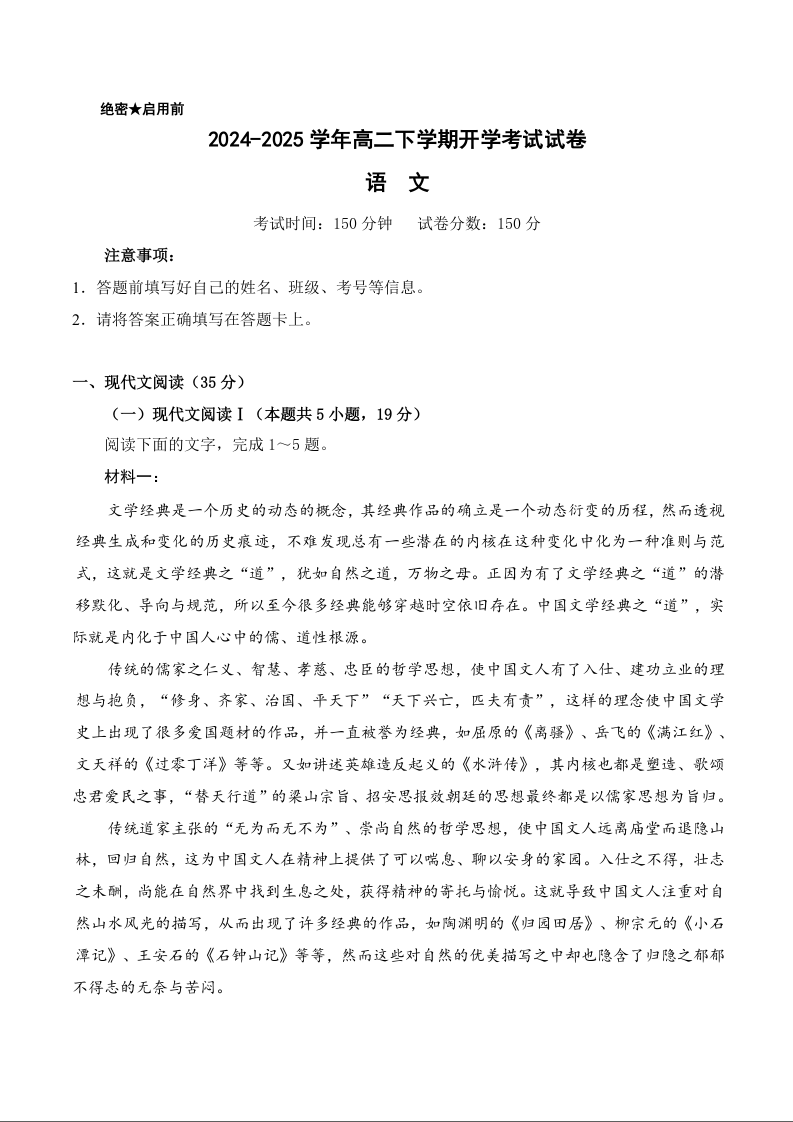 河北省保定市部分高中2024-2025学年下学期高二开学考试语文+答案