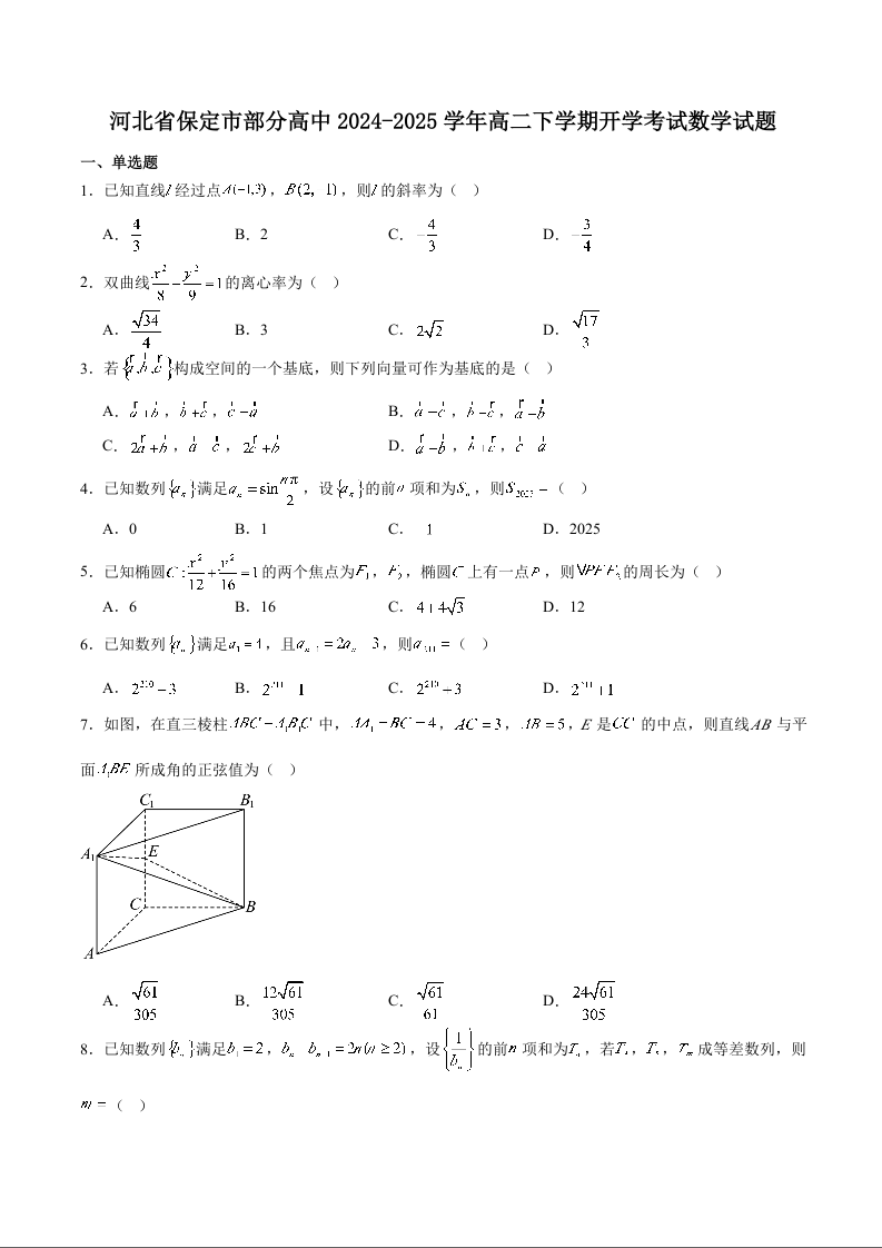 河北省保定市部分高中2024-2025学年下学期高二开学考试数学+解析