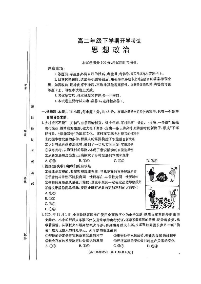 河北省保定市部分高中2024-2025学年下学期高二开学考试政治+答案